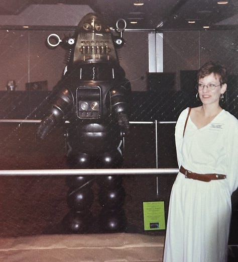 They had a Famous Monsters Famous Museum set up in the hotel. It featured props from “This Island Earth,” “King Kong,” “Earth vs. the Flying Saucers,” “The Beast from 20,000 Fathoms,” and “Forbidden Planet,” including the original, actual, in-the-flesh (plastic) Robby the Robot. Meeting Raul and Keogh for lunch among the nerds, I took a photo of her with Robby the Robot. She had the most delicious “you poor, poor child” look on her face. I was in heaven.