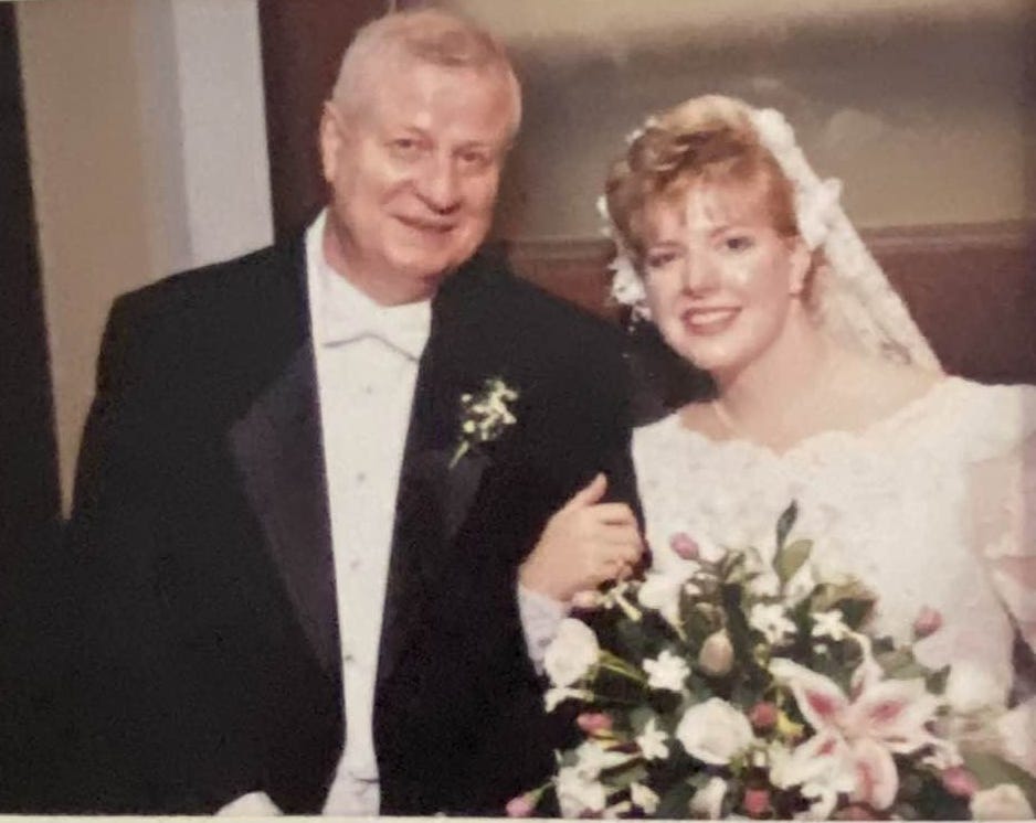 During the rehearsal, a vandal broke in and stole everything he could find in the car, which turned out to be a cloth bag with daddy’s sweaty clothes, underwear, and shoes for when he used the indoor track at the YMCA. He was pretty frustrated and visibly angry. My mother defused it by saying, “Well, you know, crime doesn’t really pay,” a reference to the smelly jockstrap the thief ended up with.